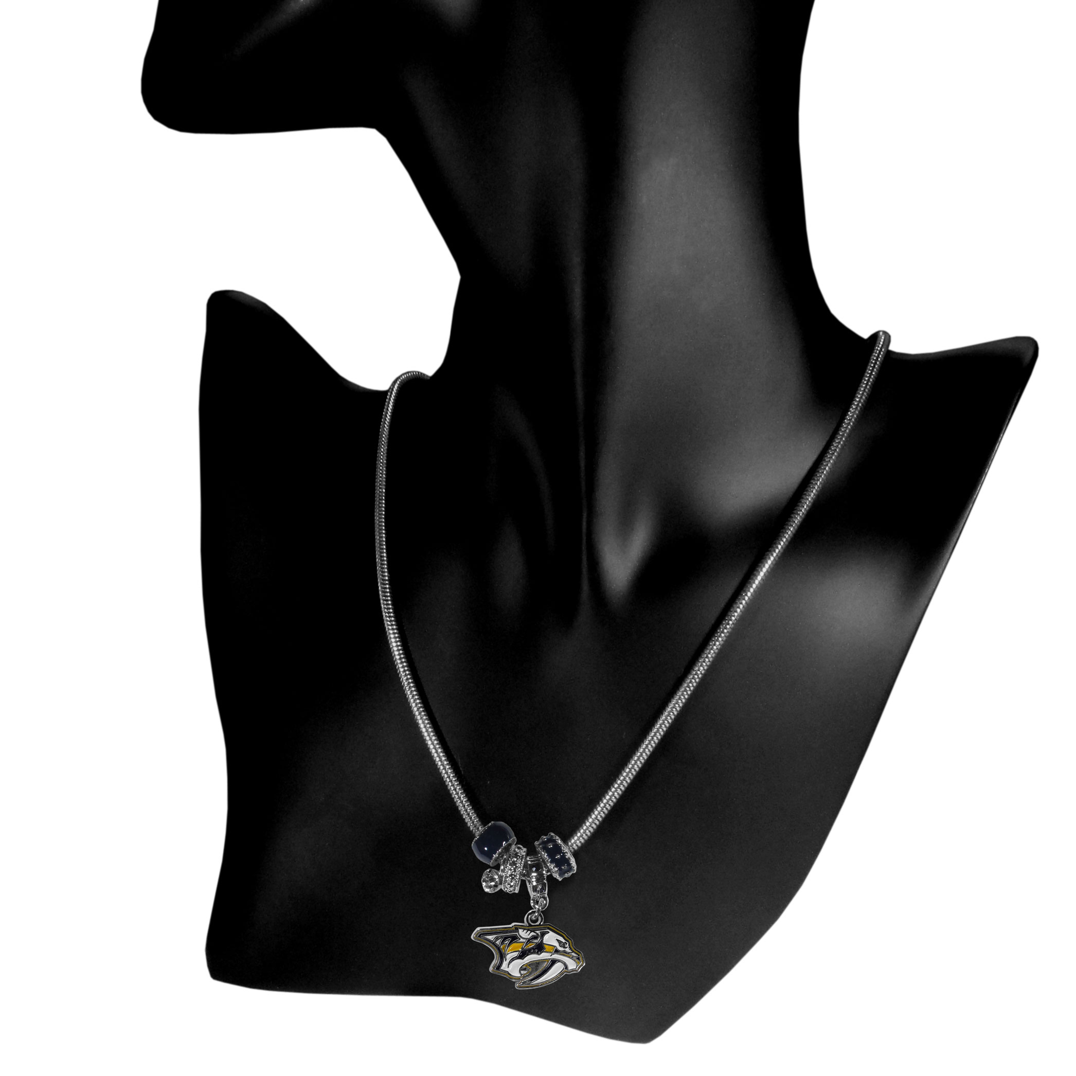Features 18″ snake chain with four Euro beads. Enameled team colors and rhinestone accents.